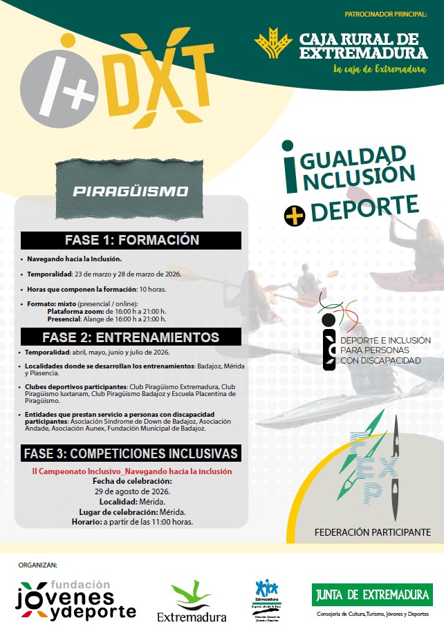 La Federación Extremeña de Piragüismo, con el patrocinio de la Fundación Jóvenes y Deporte de la Junta de Extremadura, ha sido seleccionada como beneficiaria del Programa «I+DXT» 2026, en su Línea 2: Deporte e Inclusión para personas con discapacidad.